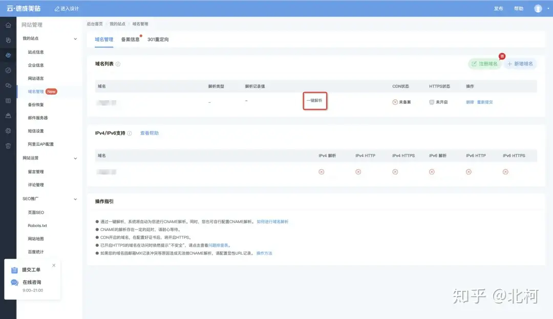2、域名解析:单击网站管理→域名管理→新增域名进行添加。请等待系统自动生成解析记录值,单击一键解析,登录阿里云账号授权即可等待一键解析完成。