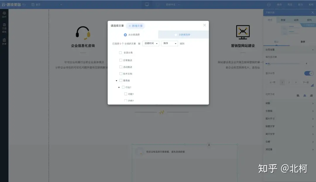 4、并上传文章数据到控件:在设计期内单击文章列表控件→设置,即可弹出快速设置面板,单击数据,选择文章。