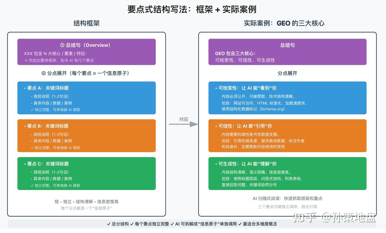 AI 不读情绪,它读结构。 内容要符合 GEO 三种写法:定义式、要点式、结论式。
